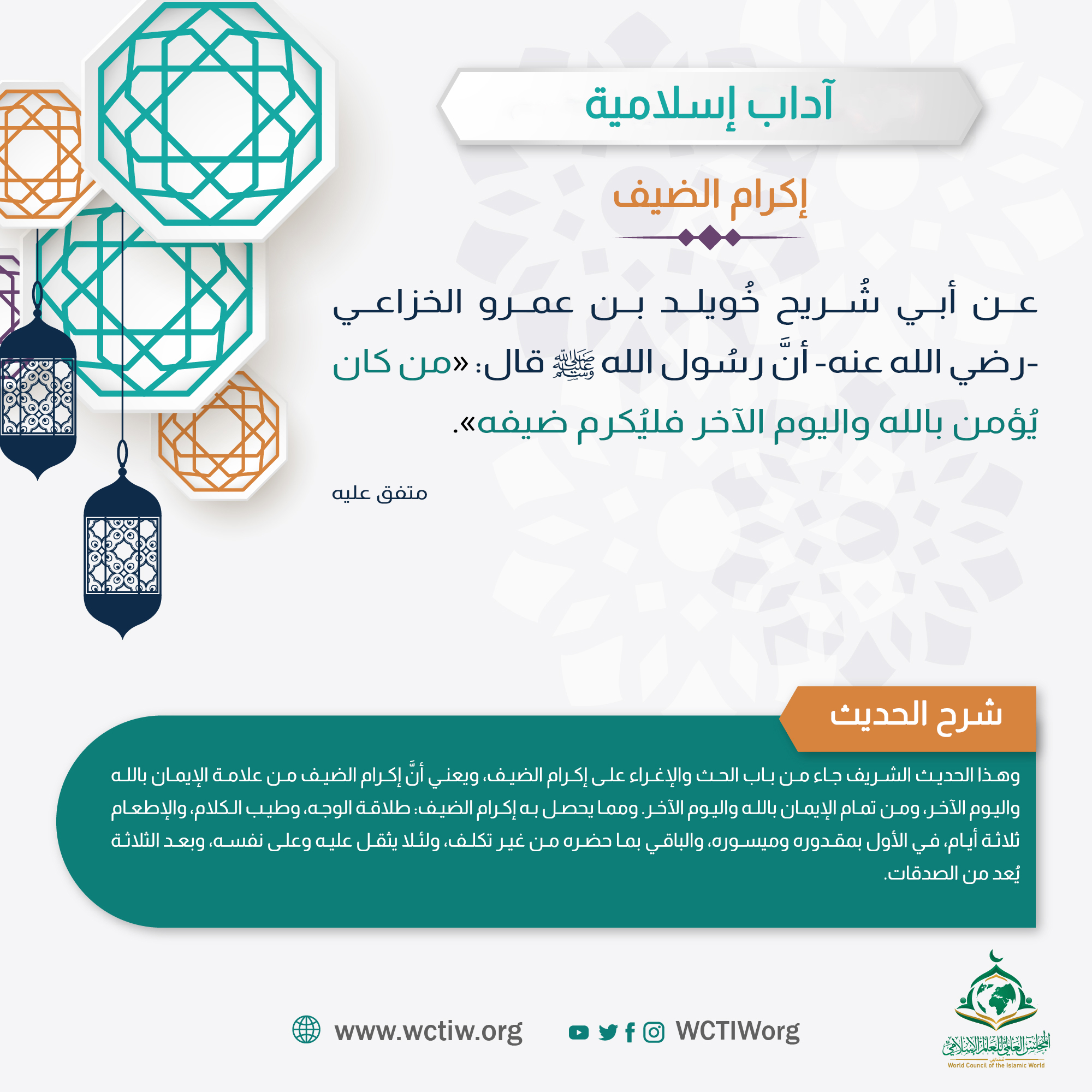 عن أبي شُريح خُويلد بن عمرو الخزاعي -رضي الله عنه- أنَّ رسُول الله ﷺ قال: «من كان يُؤمن بالله واليوم الآخر فليُكرم ضيفه».