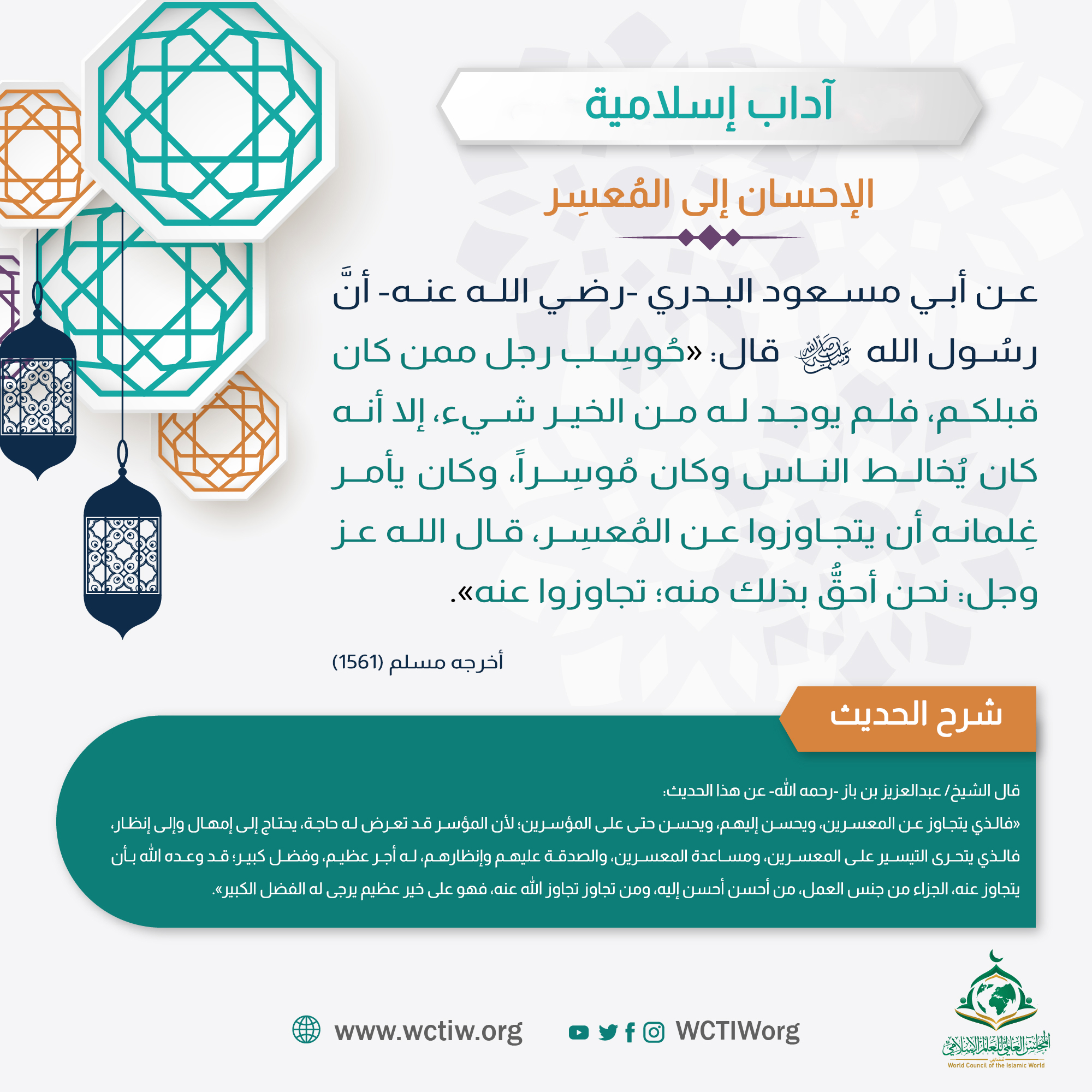 «حُوسِب رجل ممن كان قبلكم، فلم يوجد له من الخير شيء، إلا أنه كان يُخالط الناس وكان مُوسِراً، وكان يأمر غِلمانه أن يتجاوزوا عن المُعسِر، قال الله عز وجل: نحن أحقُّ بذلك منه؛ تجاوزوا عنه».