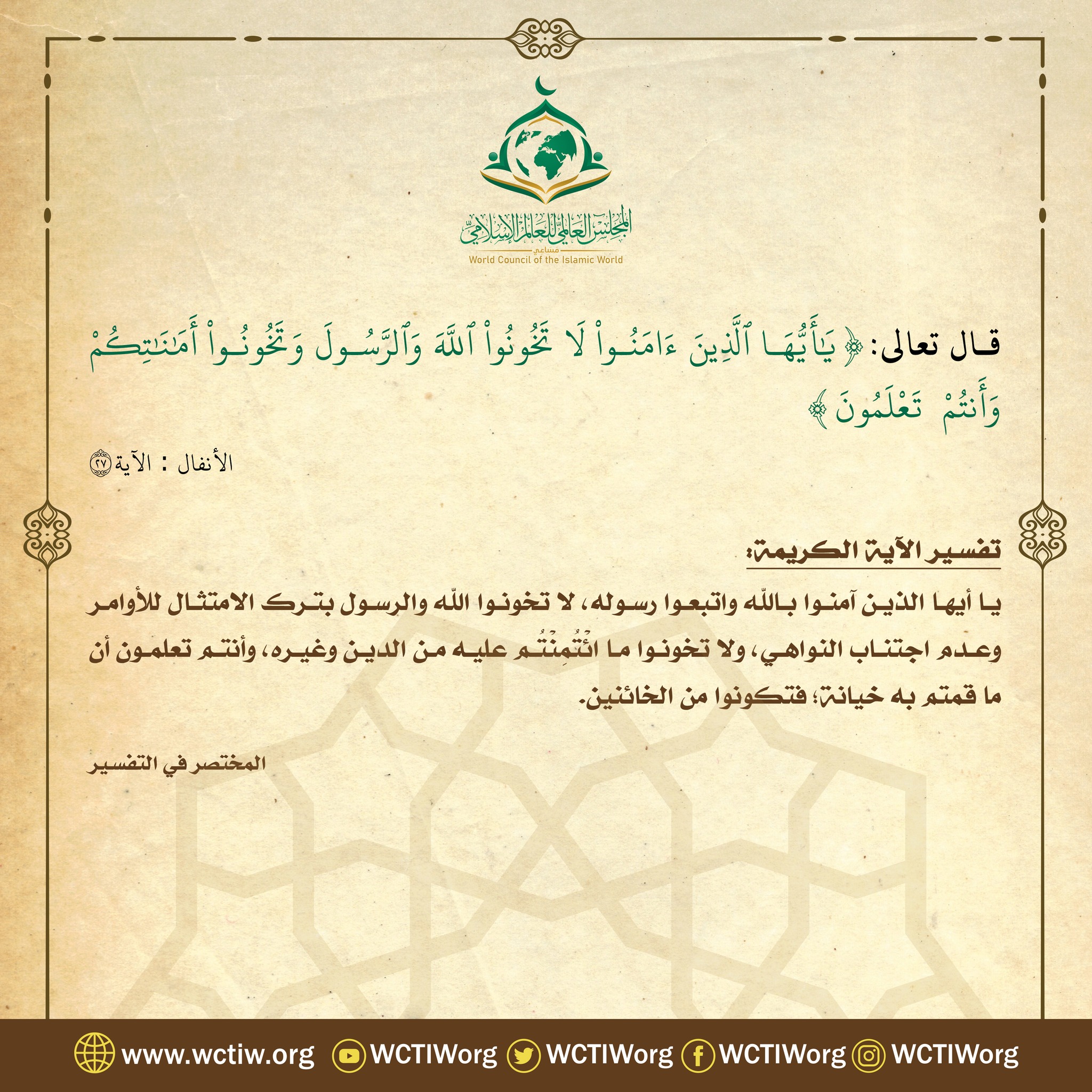 قال تعالى:{يَٰأَيُّهَا ٱلَّذِينَ ءَامَنُواْ لَا تَخُونُواْ ٱللَّهَ وَٱلرَّسُولَ وَتَخُونُواْ أَمَٰنَٰتِكُمْ وَأَنتُمْ تَعْلَمُونَ}