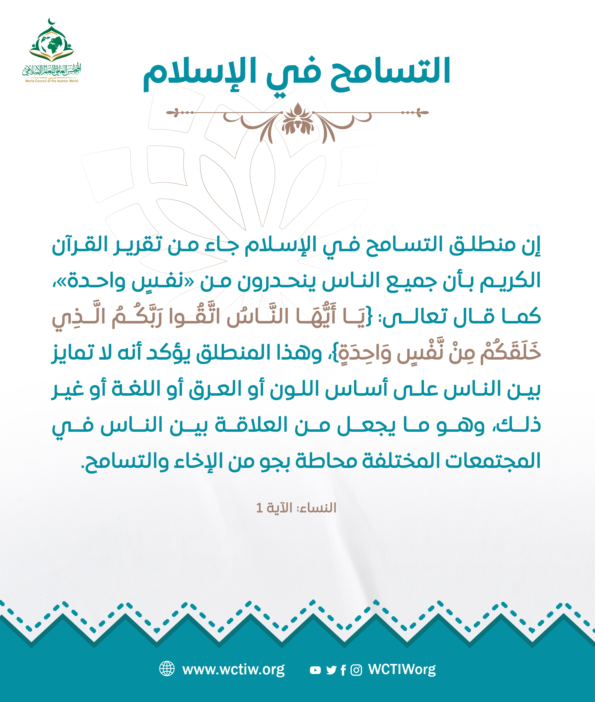 إن منطلق التسامح في الإسلام جاء من تقرير القرآن الكريم بأن جميع الناس ينحدرون من «نفسٍ واحدة»، كما قال تعالى: ﴿يَا أَيُّهَا النَّاسُ اتَّقُوا رَبَّكُمُ الَّذِي خَلَقَكُمْ مِنْ نَّفْسٍ وَاحِدَةٍ﴾، وهذا المنطلق يؤكد أنه لا تمايز بين الناس على أساس اللون أو العرق أو اللغة أو غير ذلك، وهو ما يجعل من العلاقة بين الناس في المجتمعات المختلفة محاطة بجو من الإخاء والتسامح.