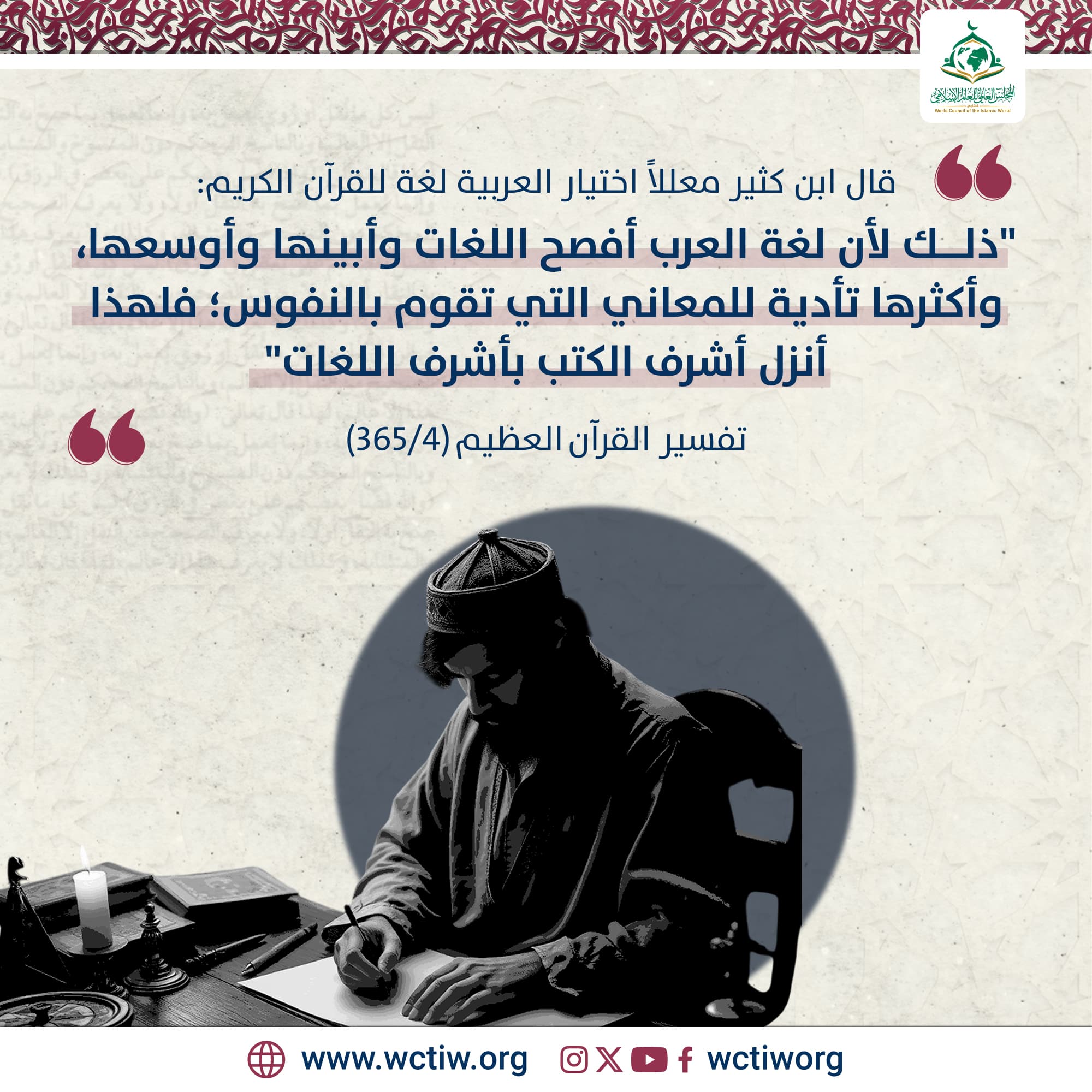 قال ابن كثير معللاً اختيار العربية لغة للقرآن الكريم: “ذلك لأن لغة العرب أفصح اللغات وأبينها وأوسعها، وأكثرها تأدية للمعاني التي تقوم بالنفوس؛ فلهذا أنزل أشرف الكتب بأشرف اللغات”