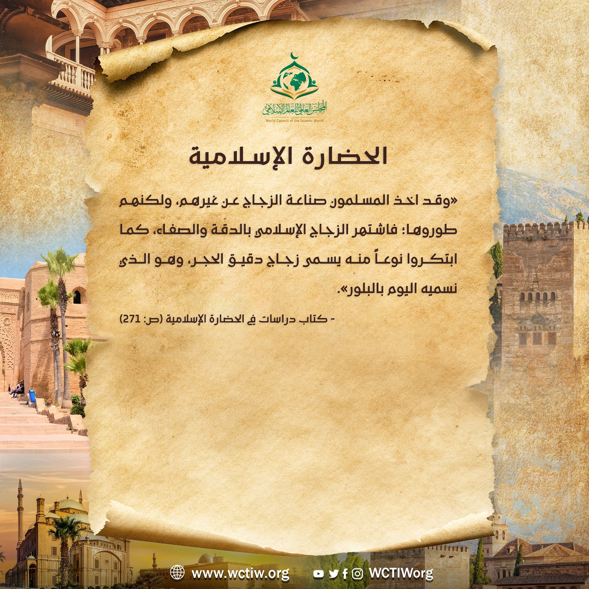 #الحضارة_الإسلامية | «وقد اخذ المسلمون صناعة الزجاج عن غيرهم، ولكنهم طوروها؛ فاشتهر الزجاج الإسلامي بالدقة والصفاء، كما ابتكروا نوعاً منه يسمى زجاج دقيق الحجر، وهو الذي نسميه اليوم بالبلور».